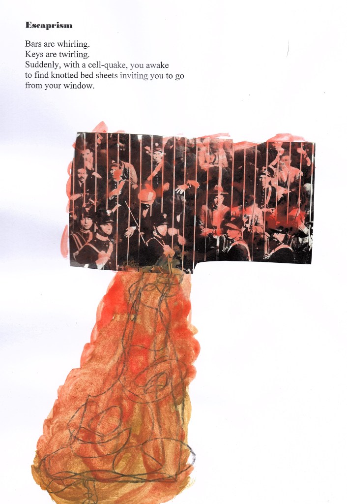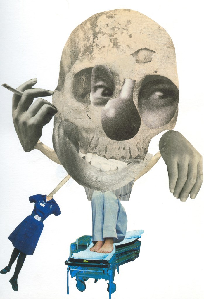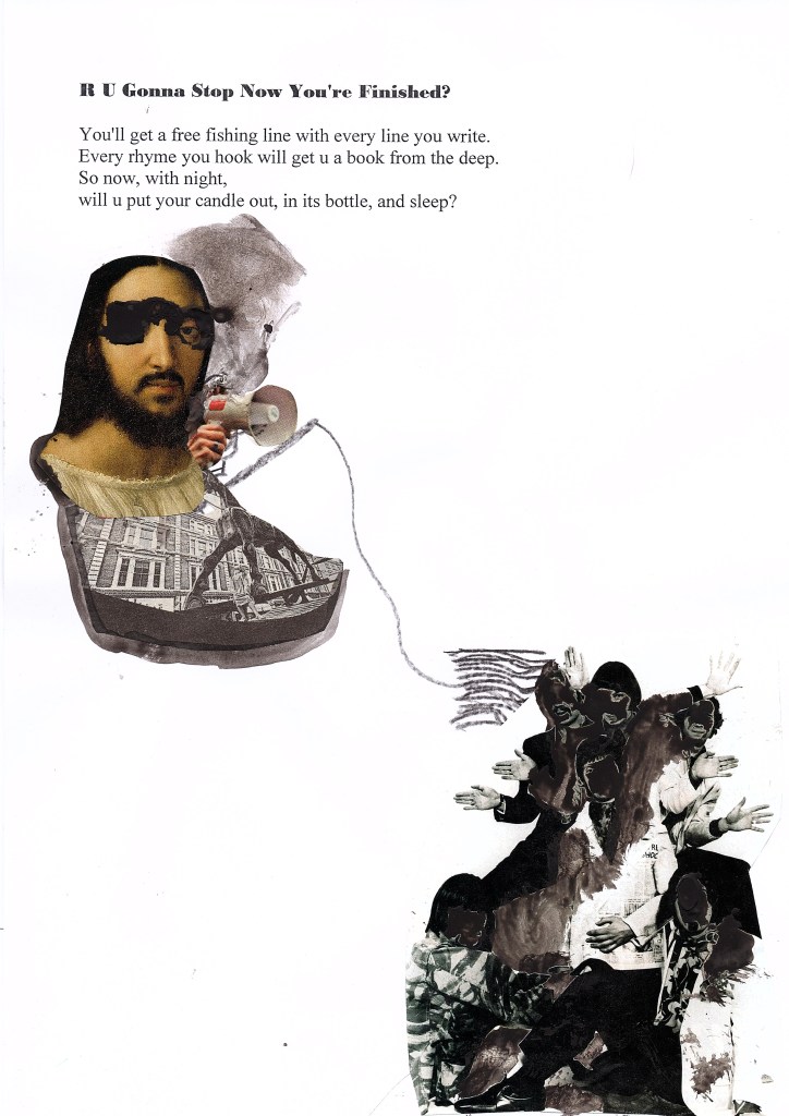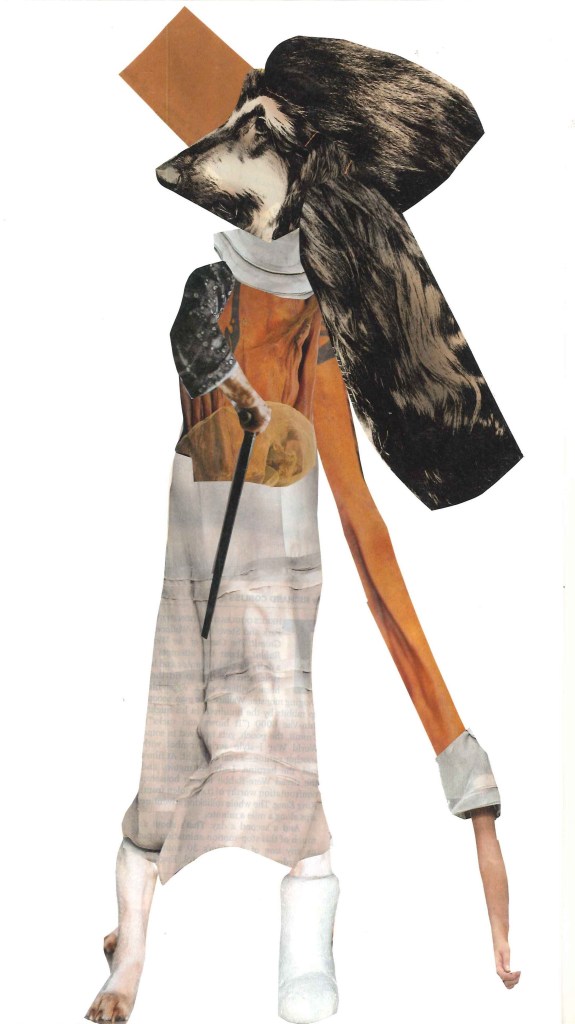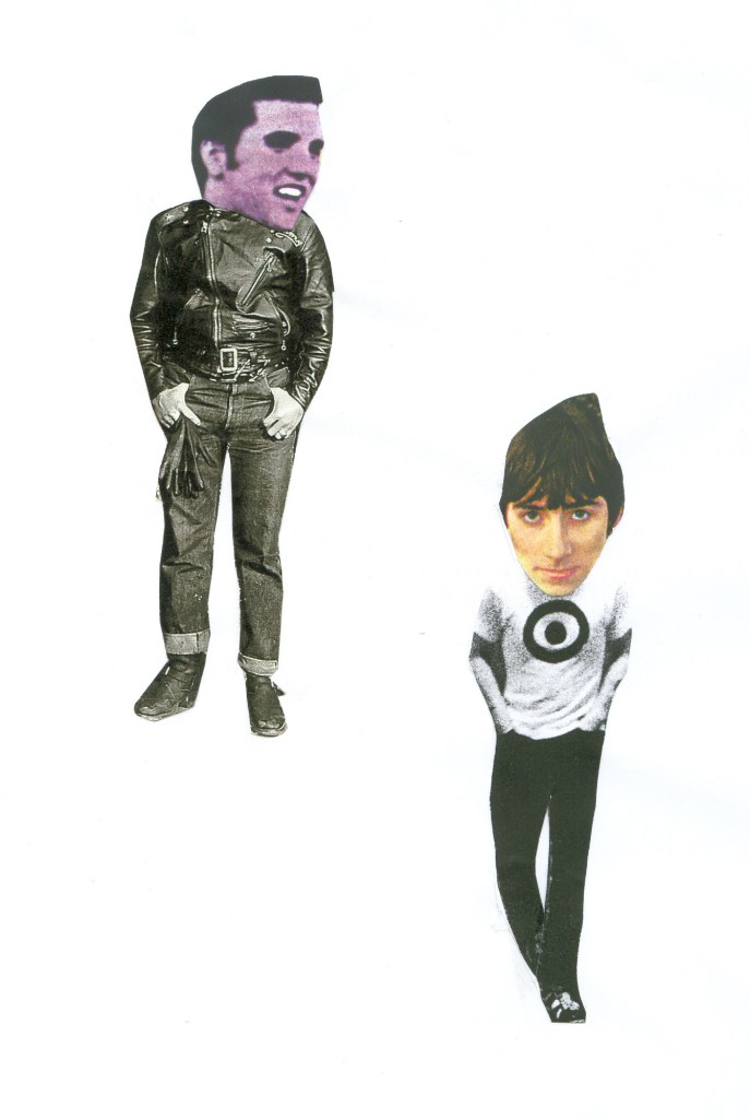 I like inventing characters that you can invent whatever you like with, and this one is one of my favourites. The collage has my old school uniform blazer in it – At times, I like the idea of doing an Alfred Hitchcock film thing of popping up somewhere in my collages without being noticed!